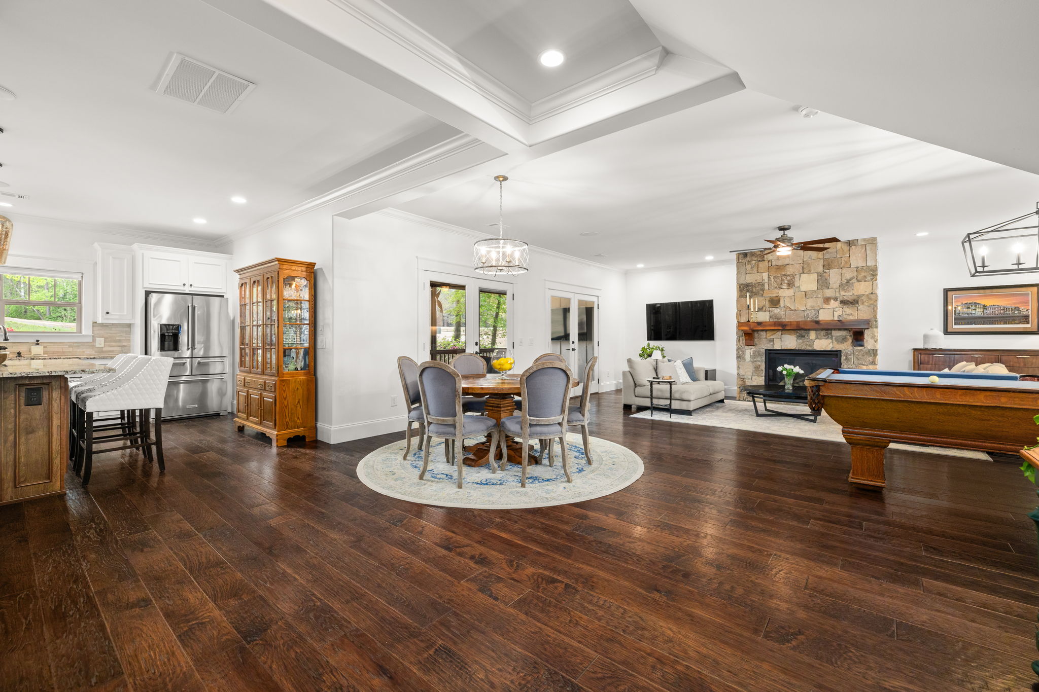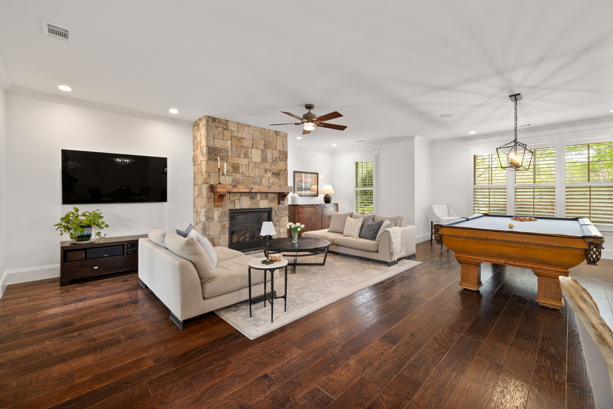 • Open floor plan with stone fireplace offering warmth and ambiance